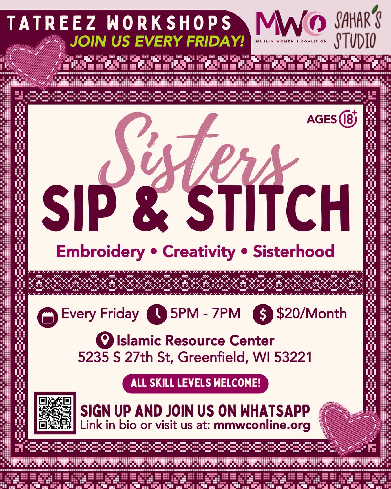 The Sip and Stitch tatreez workshops, led by Mahmoud are held at the Islamic Resource Center, 5235 S. 27th Street, Greenfield, Wisconsin, each Friday from 5-7 p.m. All skill levels are welcome, but sisters must be 18 or older to participate in the workshops where, according to the class description, they will “learn foundational stitches, create meaningful pieces like bookmarks and keychains and build lasting bonds through the art of embroidery.” Cost is $20 a month. Sign up here.