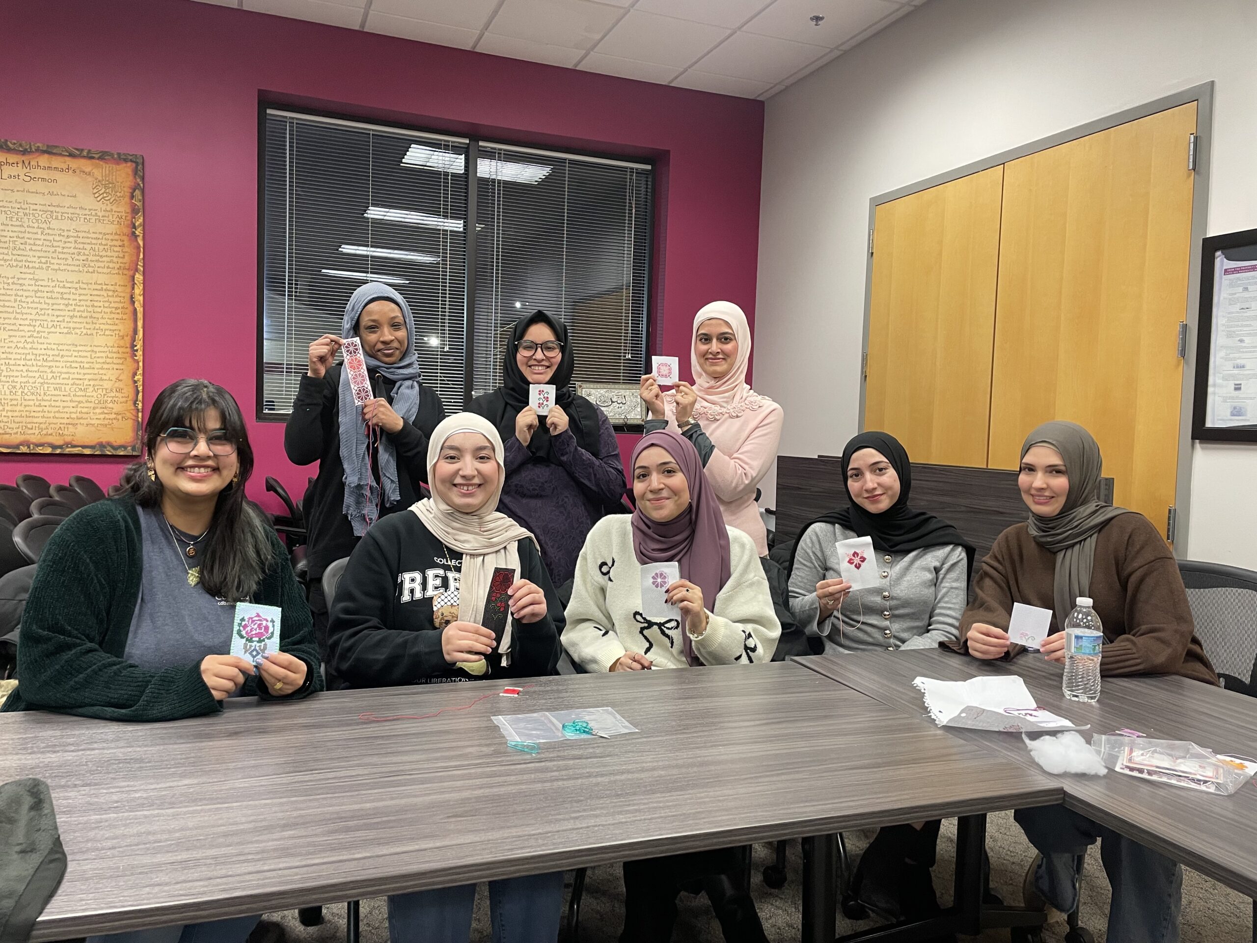 Participants pose with their in-progress tatreez projects during a Sisters Sip & Stitch workshop at the Muslim Women’s Coalition
