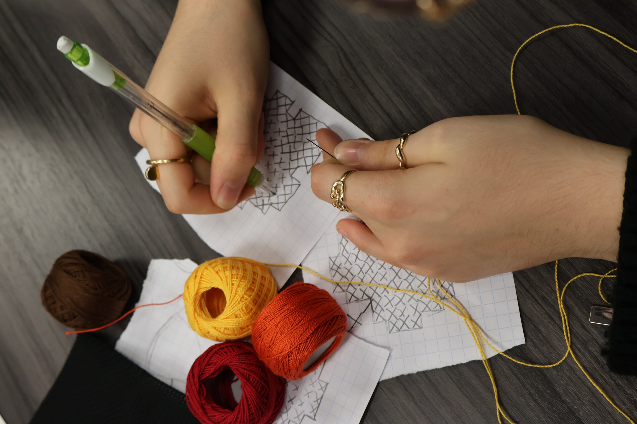 Hands thread a needle over a tatreez template during a Sisters Sip & Stitch workshop led by Sahar’s Studio at the Islamic Resource Center, where participants carry forward a centuries-old Palestinian embroidery tradition