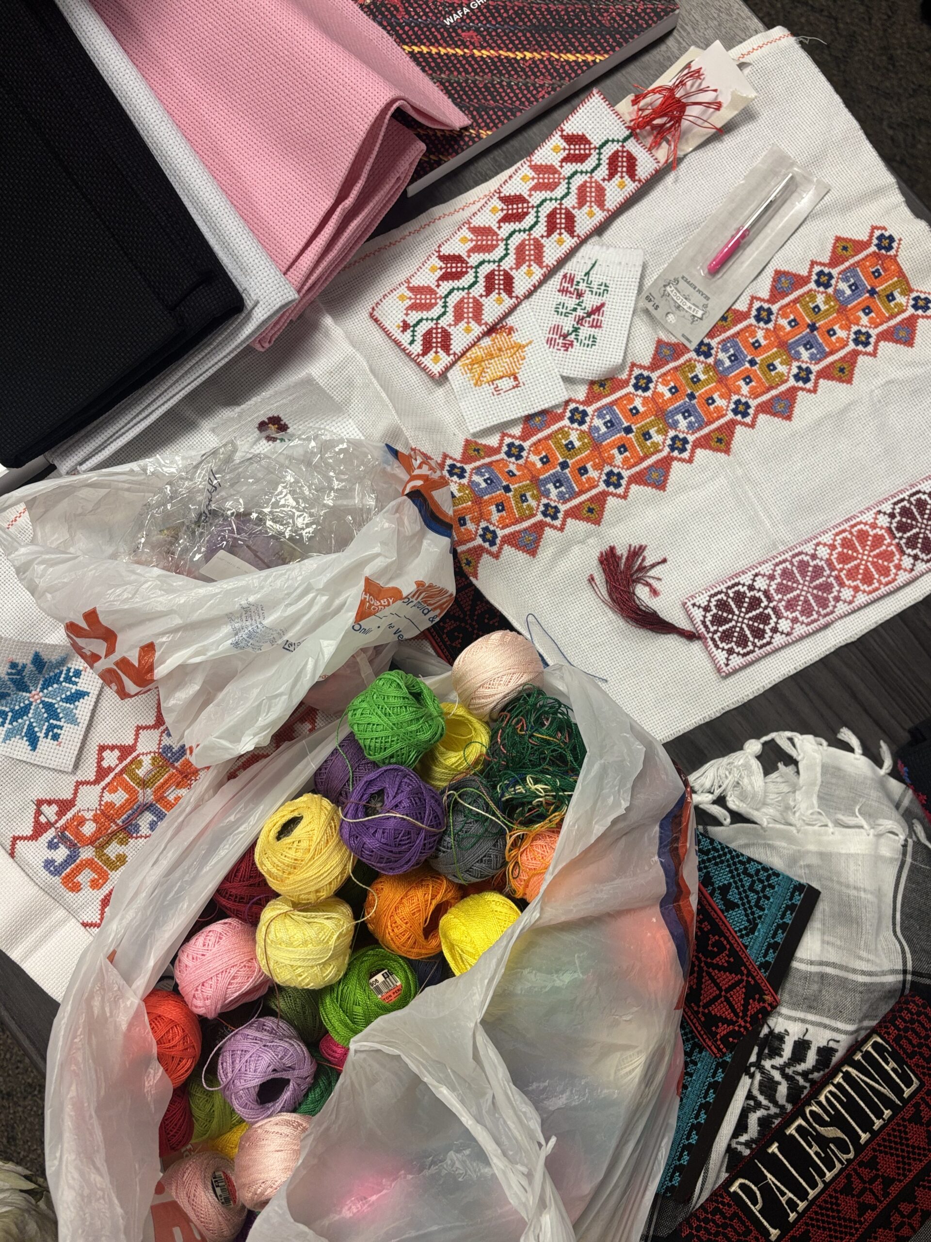 Tatreez materials, from threads to templates and reference pieces, take on all the colors of the rainbow during a Sisters Sip & Stitch session
