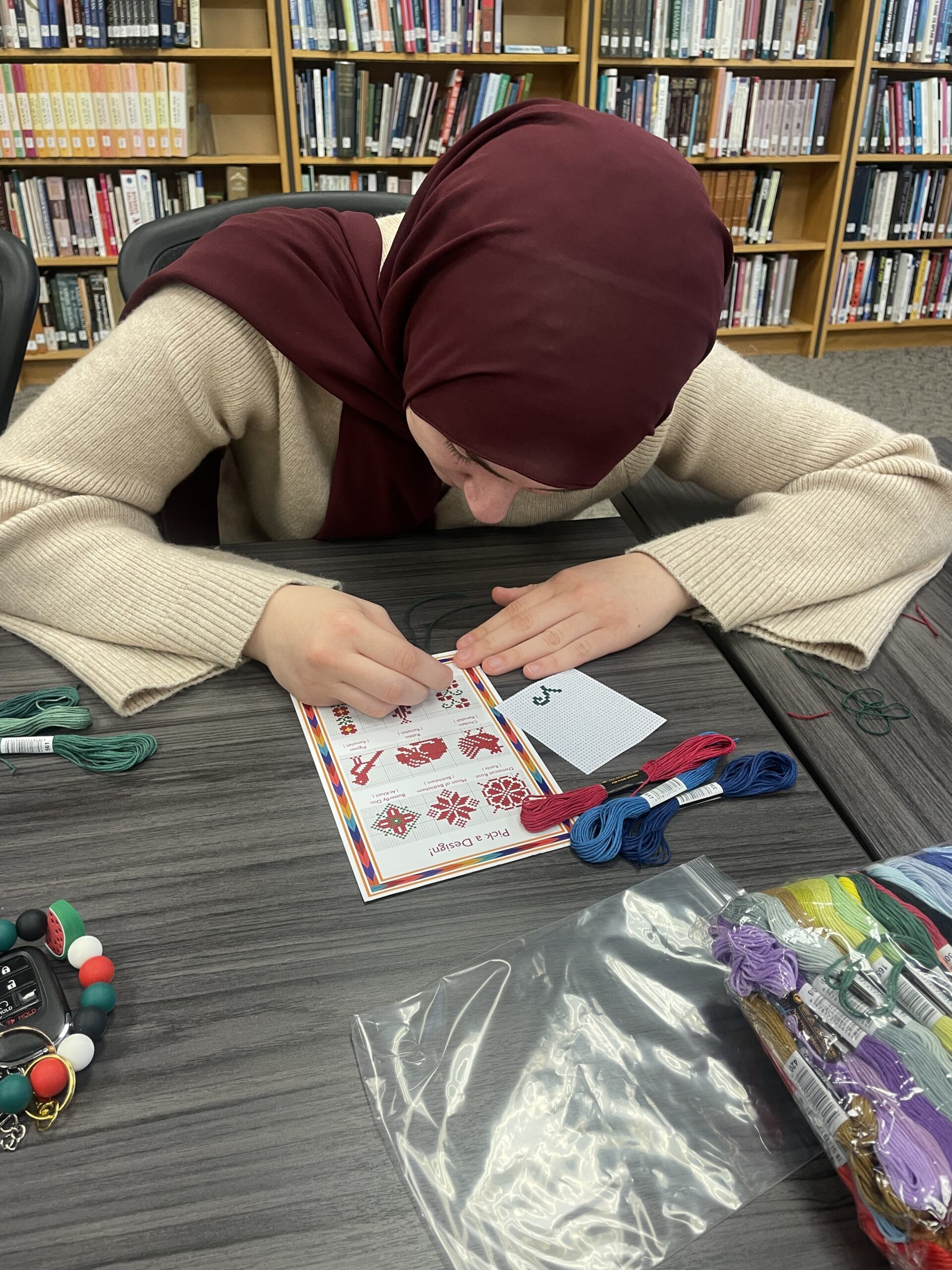 A participant refers to a pattern template while working on a tatreez embroidery project during a Sip & Stitch workshop