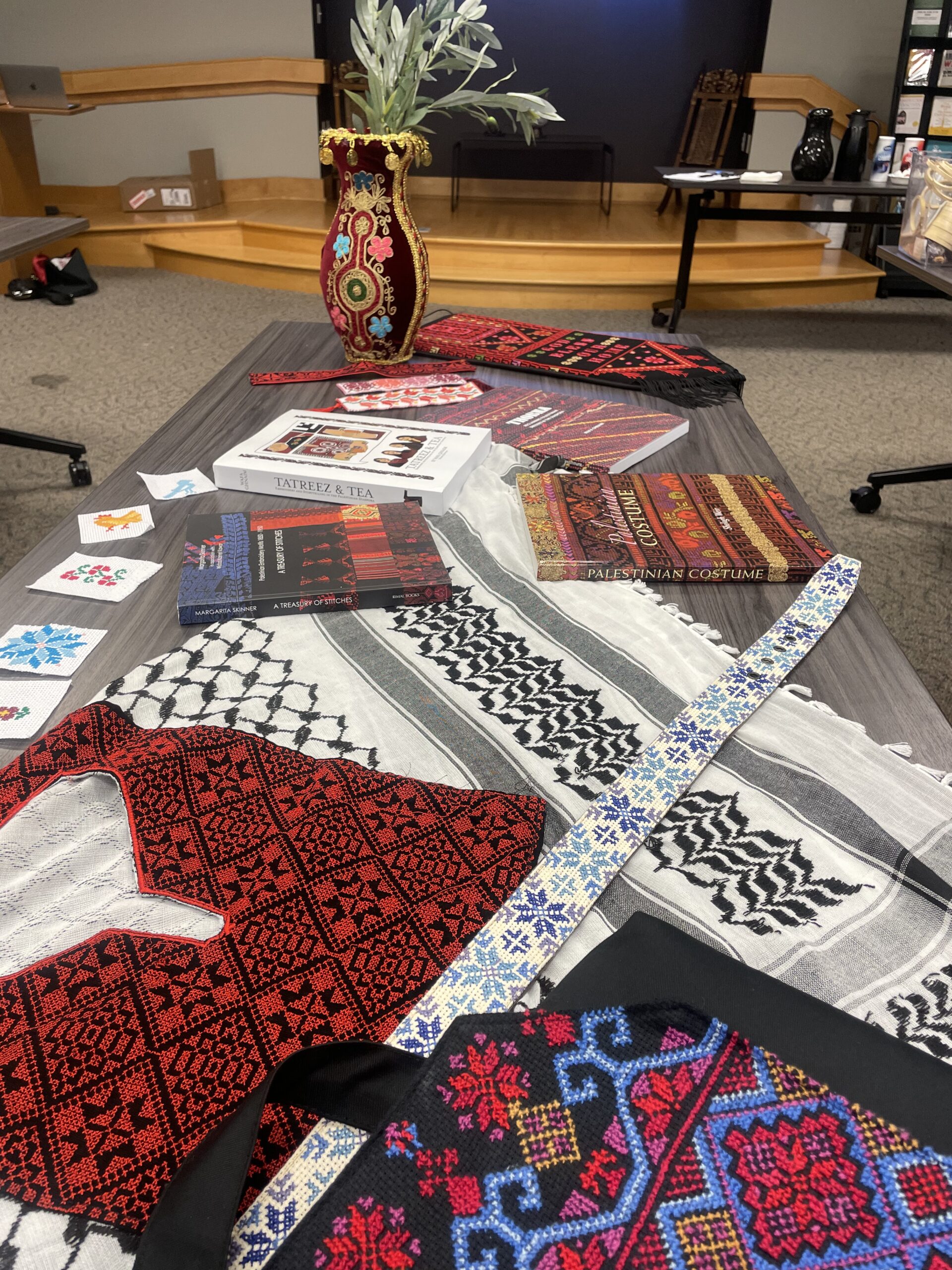Tatreez embroidery projects and reference books are displayed on a table for inspiration