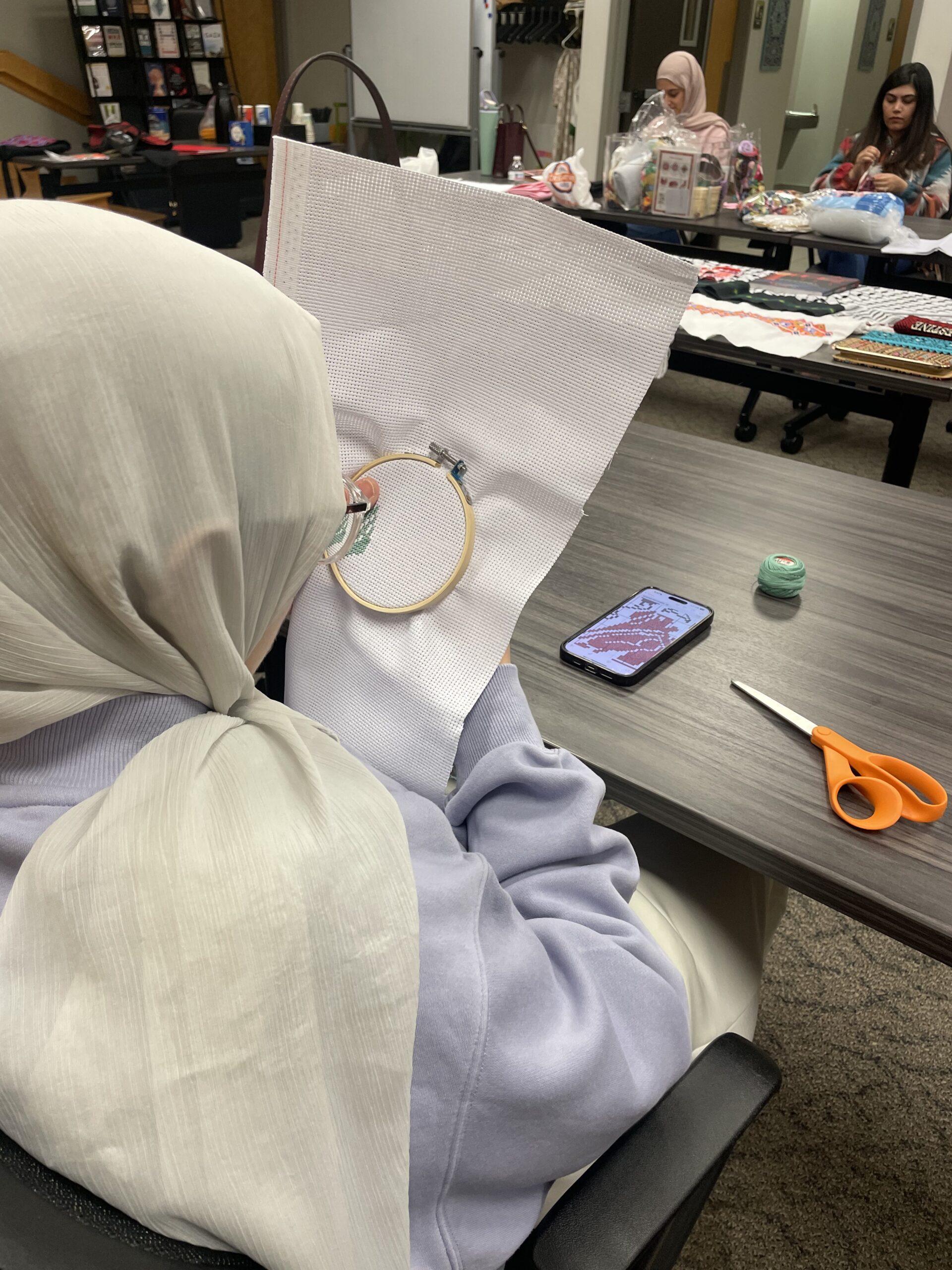 Women fill the room while attending Asad’s tatreez workshop at the Islamic Resource Center, one of the first workshops of its kind in Milwaukee