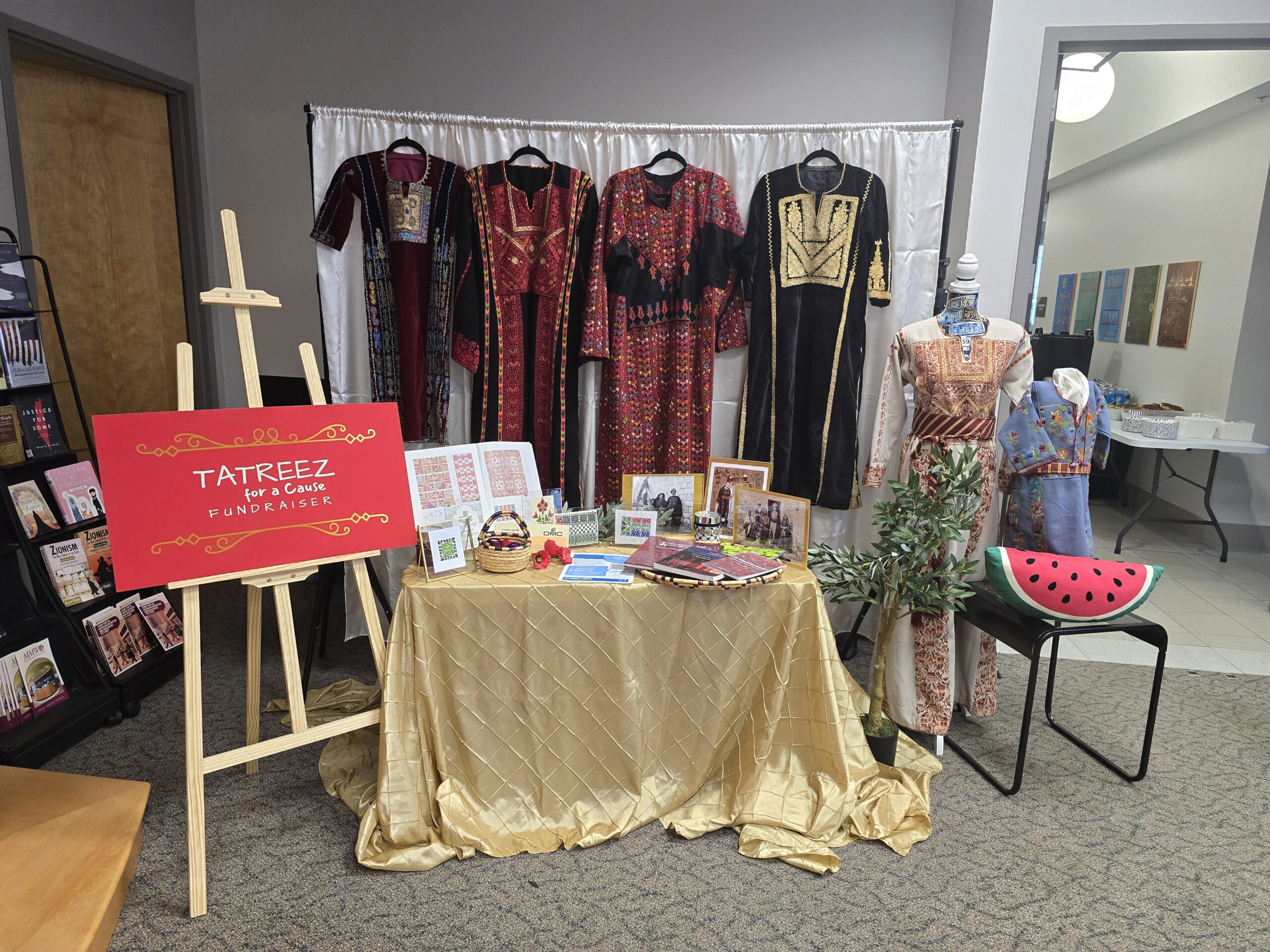 Embroidered clothing and Palestinian cultural memorabilia decorate the entrance to Asad’s tatreez workshop held in November 2024