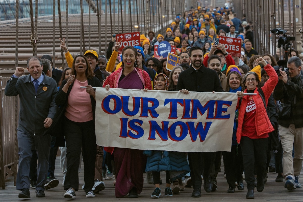 Zohran Mamdani and supporters march over the Brooklyn Bridge in New York City on November 3, 2025. (Photo: https://x.com/zohrankmamdani)