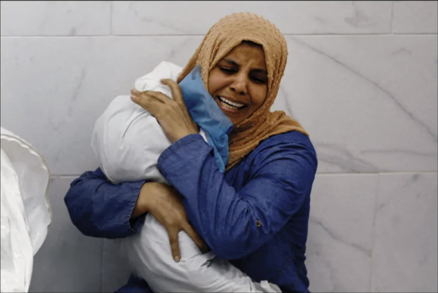 One of the most powerful images shows Palestinian woman Inas Abu Maamar, 36, embracing the body of her 5-year-old niece Sally, who was killed in an Israeli strike, at Nasser Hospital in Khan Younis in the southern Gaza Strip on October 17, 2023.