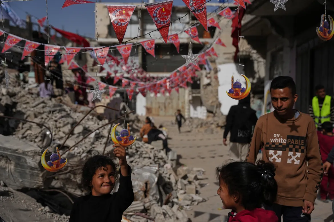 Palestinians hang decorations beside the rubble of destroyed homes as they prepare for the holy month of Ramadan in Khan Younis, southern Gaza Strip. [Abdel Kareem Hana/AP Photo]