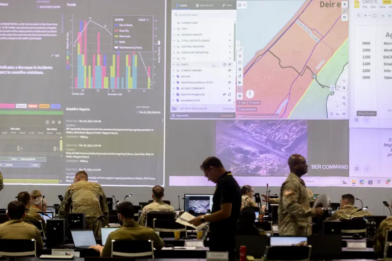 US Army personnel, Israeli military personnel and other international officials monitor screens displaying maps and imagery of the Gaza Strip during a media tour inside the Civil-Military Coordination Center (CMCC) on November 20, 2025 in Kiryat Gat, Israel. [Amir Levy/Getty Images]