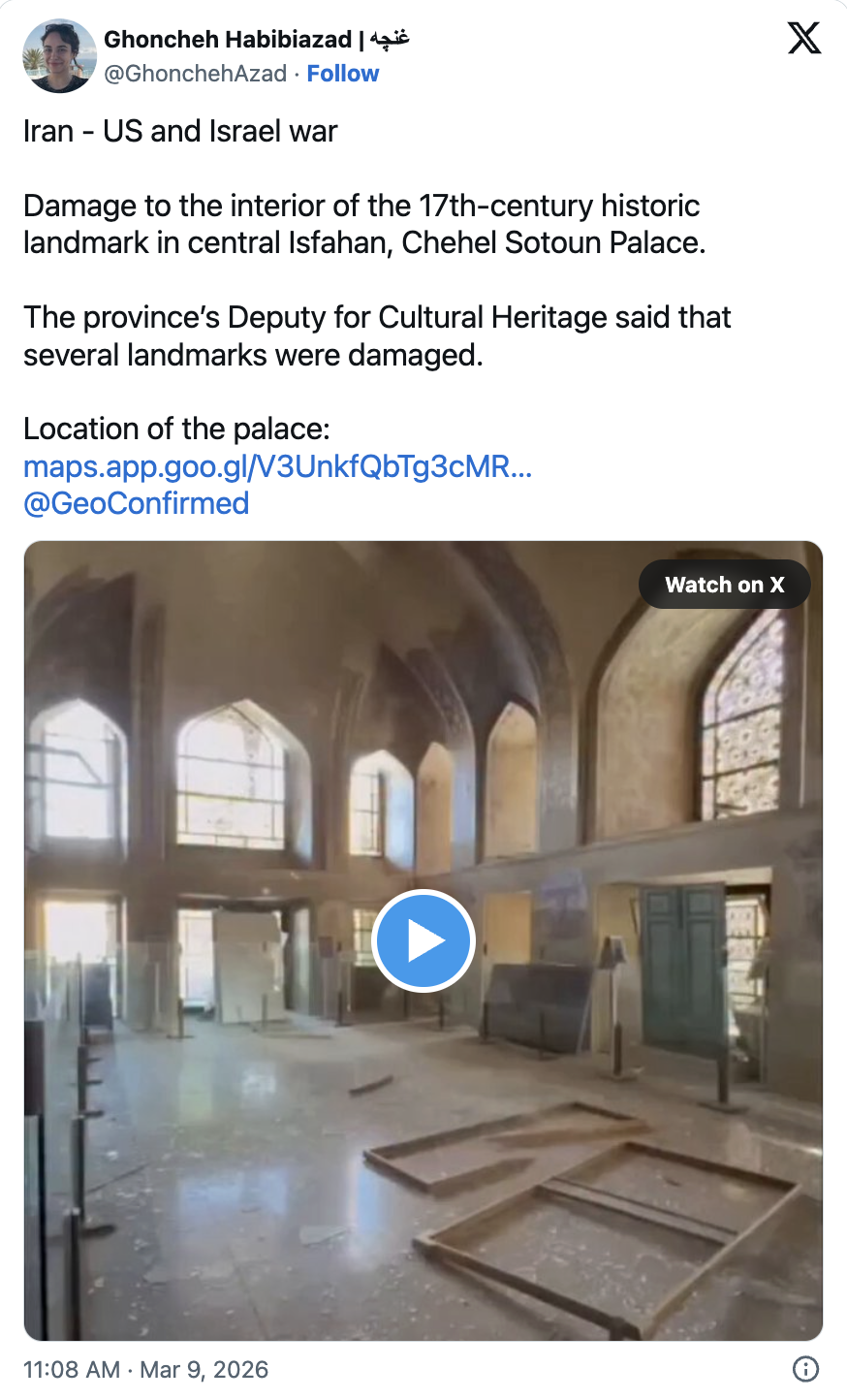 A string of key heritage sites in Isfahan were damaged by US-Israeli attacks, including the Chehel Sotoun Palace (Forty Columns).