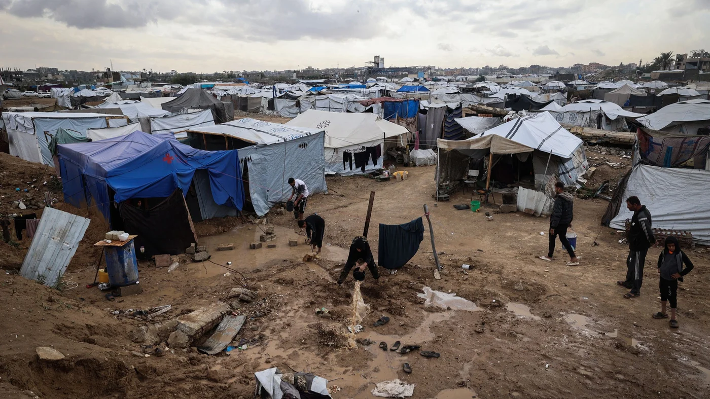 Palestinian men empty buckets of water after heavy rain flooded a makeshift camp housing displaced people in Maghazi refugee camp in the central Gaza Strip on 25 November 2025 (Eyad Baba/AFP)