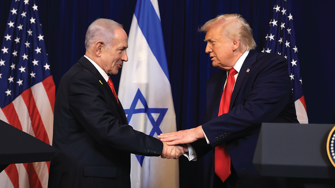 U.S. President Donald Trump and Israeli Prime Minister Benjamin Netanyahu shake hands during a press conference at Trump’s Mar-a-Lago club in Palm Beach, Florida, on Dec. 29, 2025. (Joe Raedle/Getty Images)