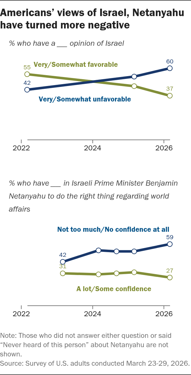 - 60% of U.S. adults have an unfavorable view of Israel, up from 53% last year.