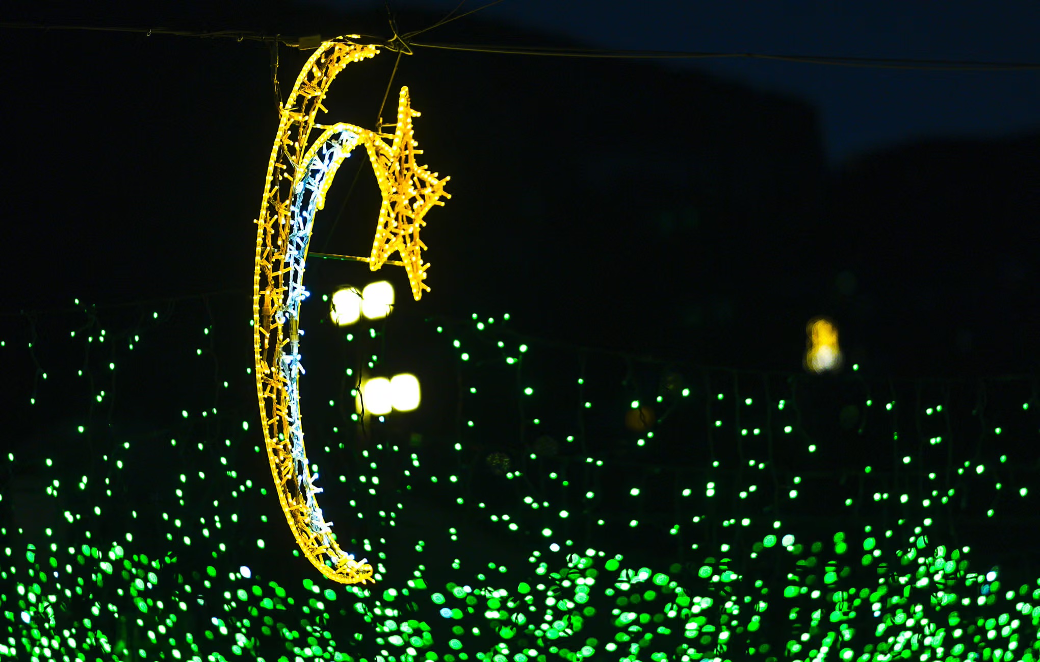Historic Baščaršija, a bazaar, is decorated with moon and star-shaped illuminations to celebrate Ramadan in Sarajevo, Bosnia and Herzegovina.Photograph: Anadolu/Getty Images
