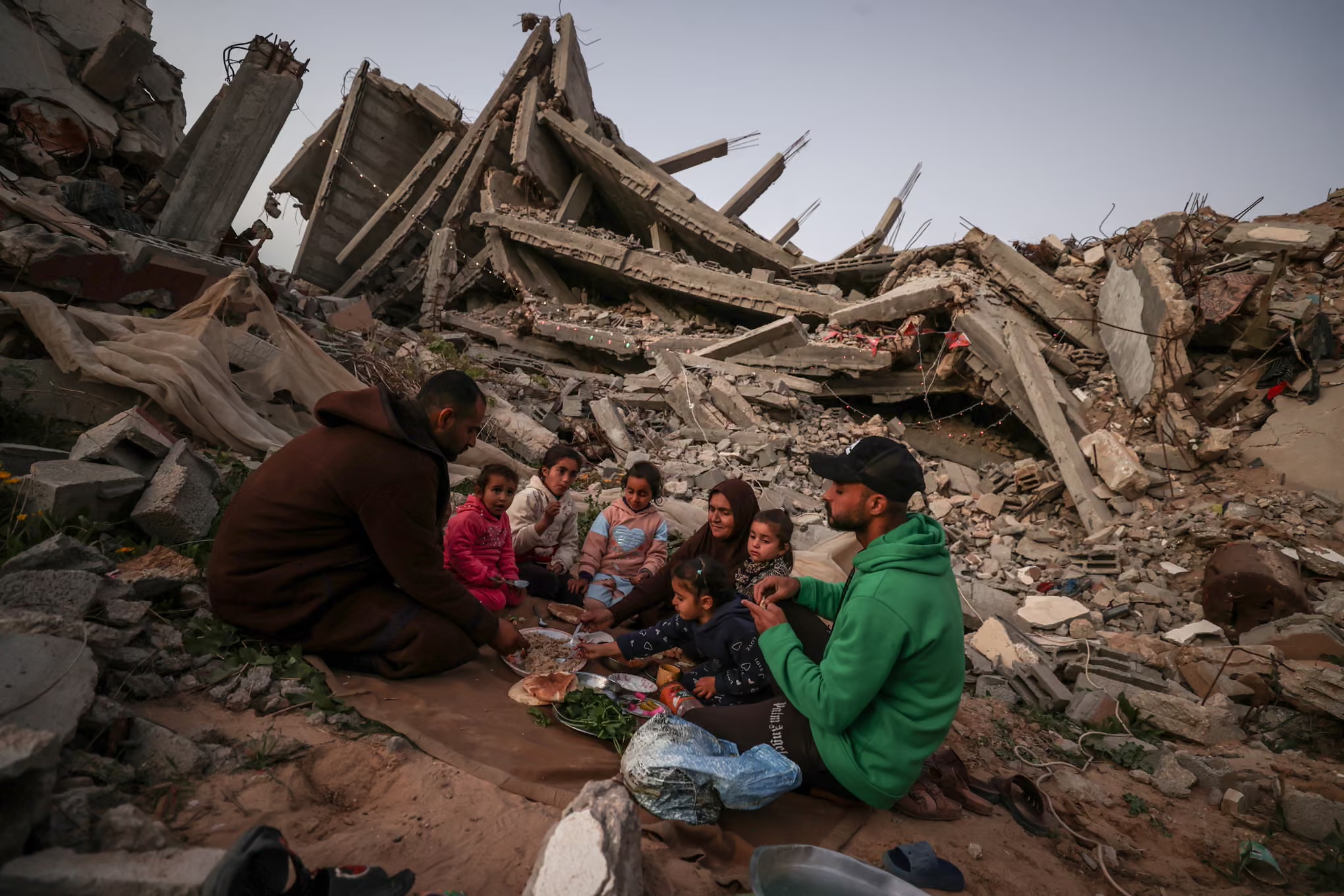 A Palestinian family living in the Tel al-Hawa neighbourhood breaks their first Ramadan fast near the rubble of their home destroyed after the Israeli attacks on Gaza.Photograph: Anadolu/Getty Images