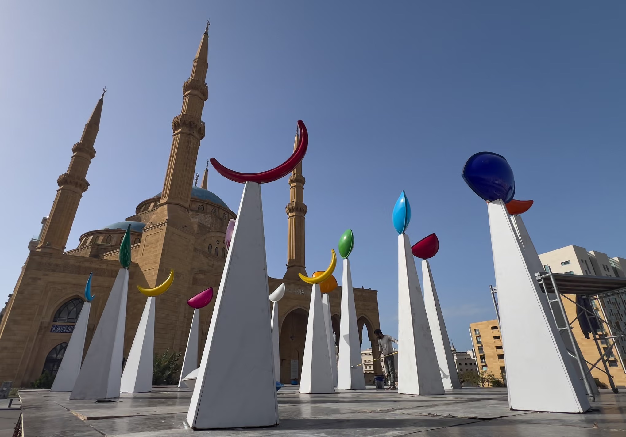 A worker, centre, paints decorations in preparation for Ramadan in downtown Beirut, Lebanon.Photograph: Hussein Malla/AP