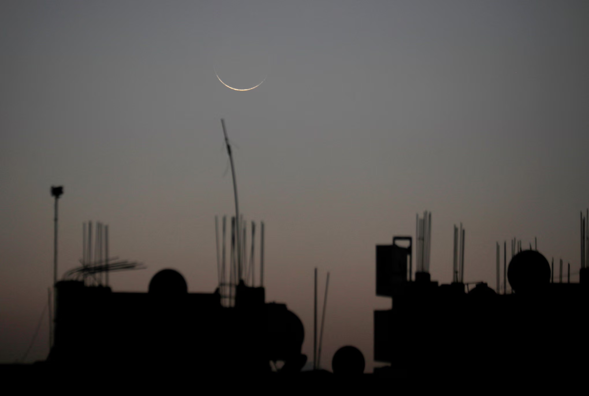 A crescent moon shines in the sky on the first day of Ramadan in Sana’a, Yemen.Photograph: Yahya Arhab/EPA