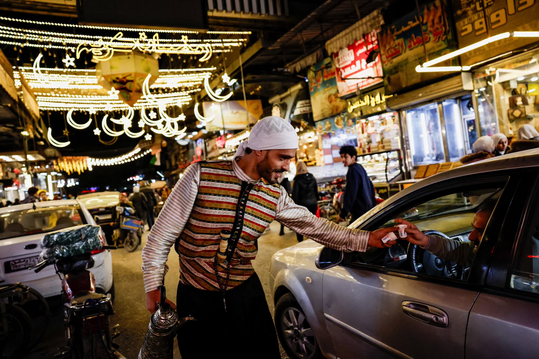 A person in traditional attire offers a drink to someone inside a car in a decorated market street as Muslims prepare for Ramadan in Damascus, Syria.Photograph: Yamam Al Shaar/Reuters