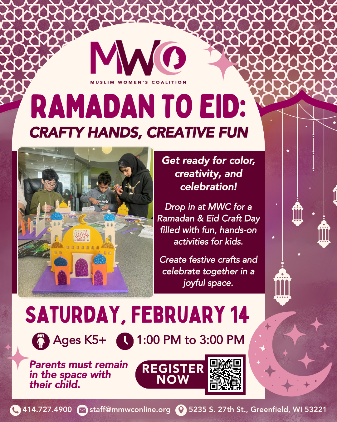 Another program “Ramadan to Eid: Crafty Hands, Creative Fun,” is scheduled for Saturday, February 14, from 1-3 p.m., at the Muslim Women’s Coalition for children five and older. This annual event offers festive craft-making and activities. Parents must remain in the space with their children. Seating is limited and registration is required. Find event details on the MWC website.
