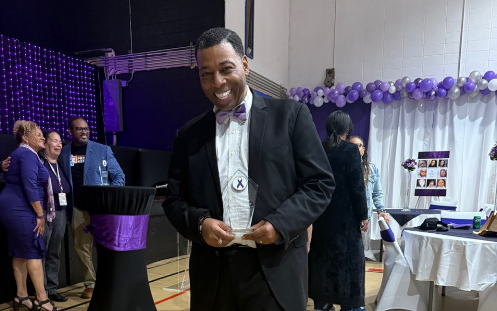 Shawn Muhammad, director of Asha’s Ujima Men’s Program shows his “Male Advocate of the Year” award presented to him at the Office of Community Wellness and Safety’s Love Without Violence Conference.