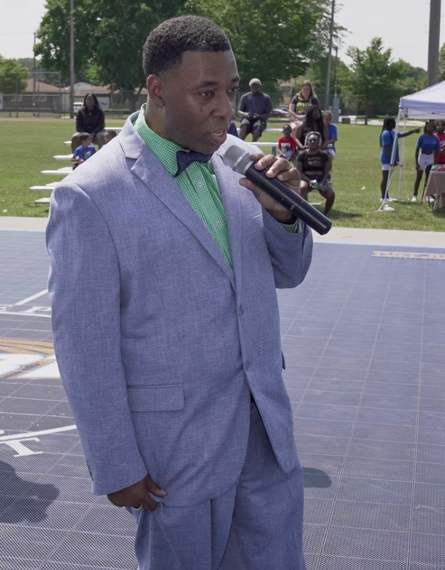 Shawn Muhammad addresses youth basketball league about resolving conflict without violence and promotes his Community Code of Conduct.
