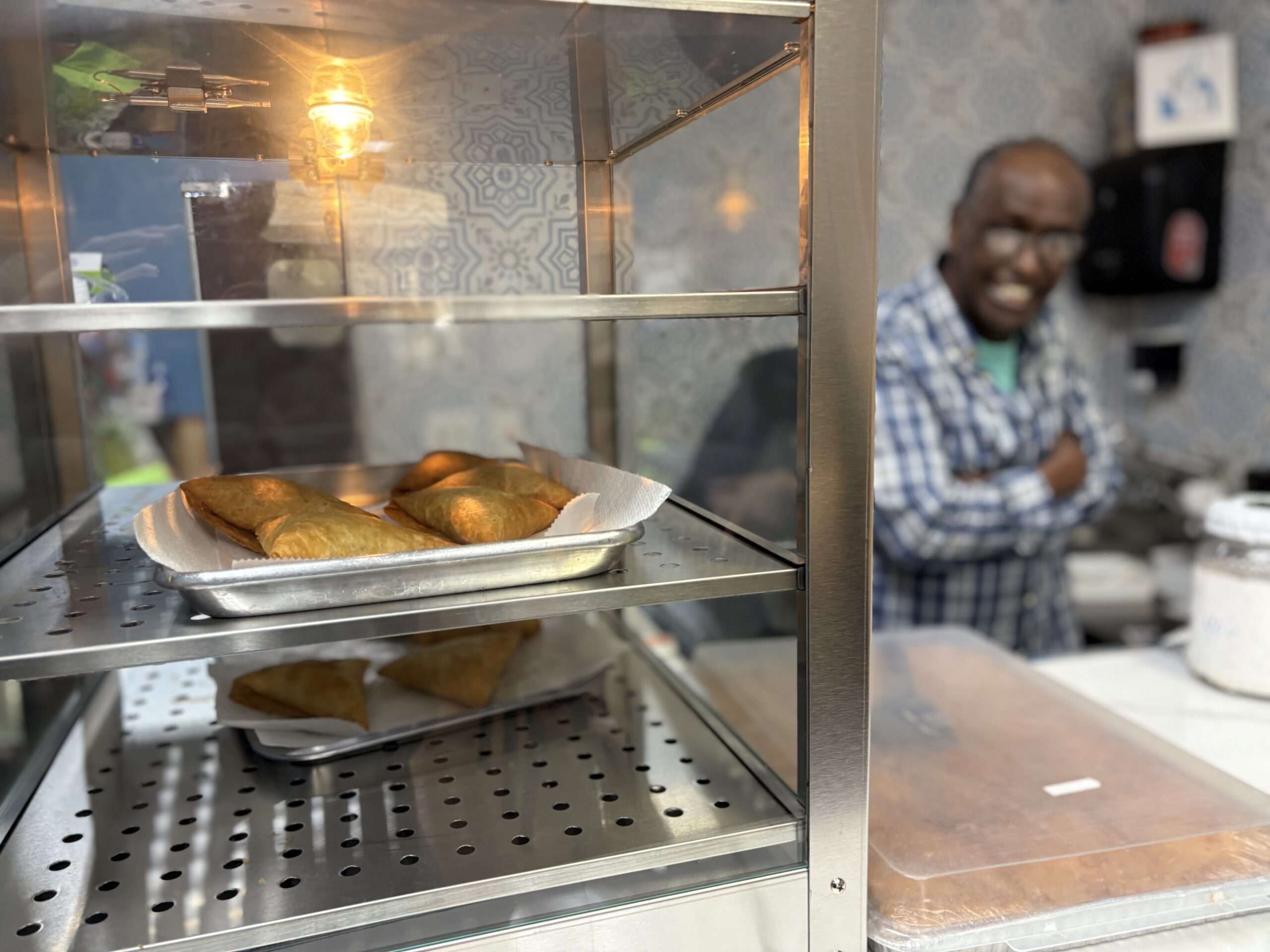 “It’ll be ready in 15 minutes,” he said into the phone, while Muhyadin stepped behind a short wall that separated the kitchen from the small eat-in area with a counter. Inside a glass case on one end of the counter, beef and chicken sambusas sat on trays. On the other end stood a review in the Marquette Wire, mounted on a board and laminated. When calls stopped, Aden sat with WMJ and continued an interview.