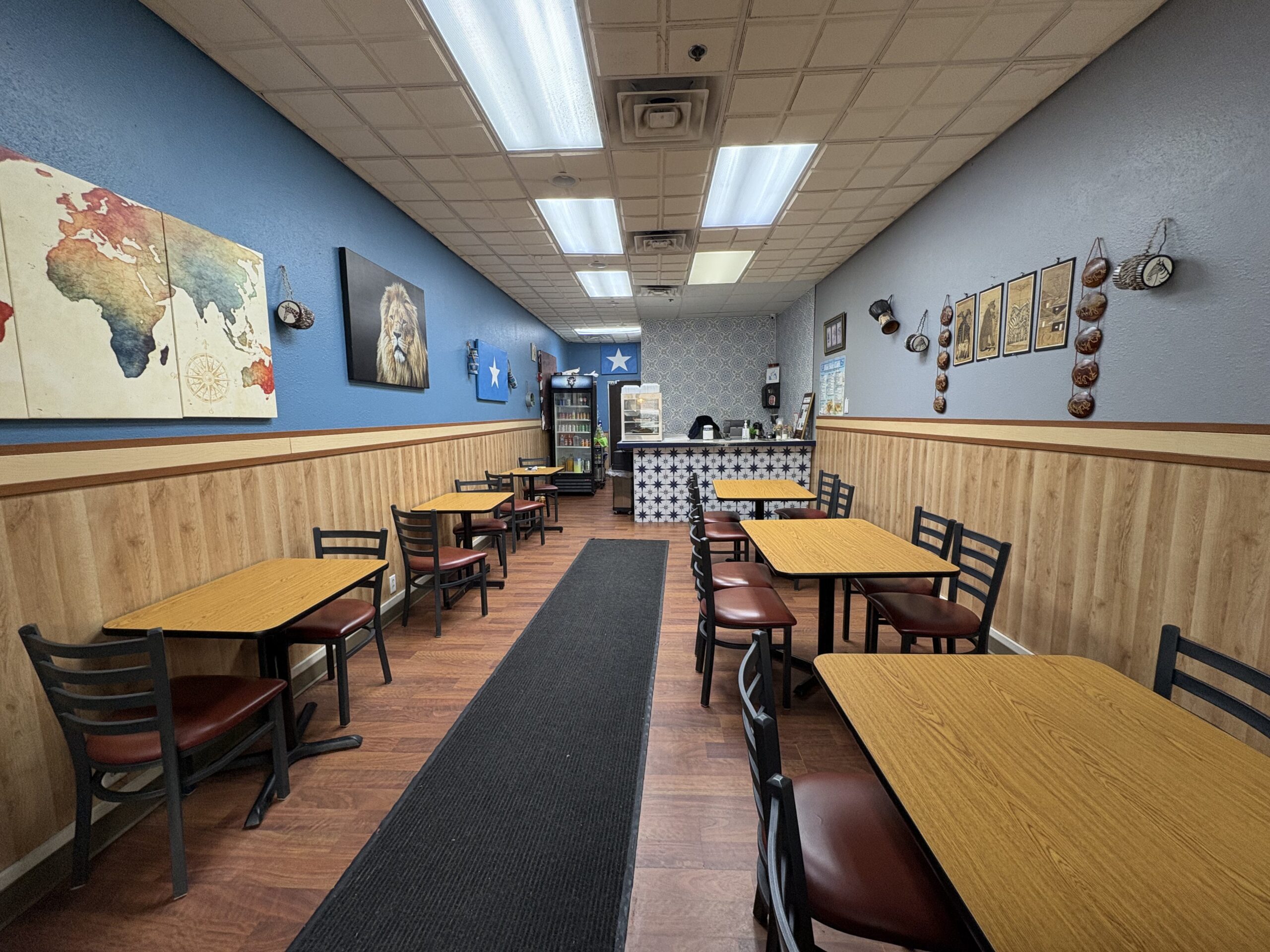 A painting of a bright blue Somali flag hangs on the wall. “The star is white, not blue, but it works,” Aden laughed.