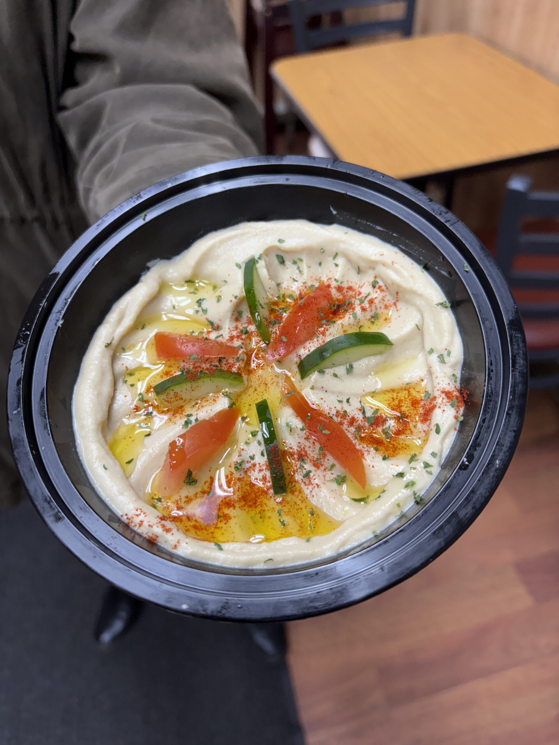 A bowl of creamy hummus, decorated with tomato and cucumber is topped with paprika and olive oil.