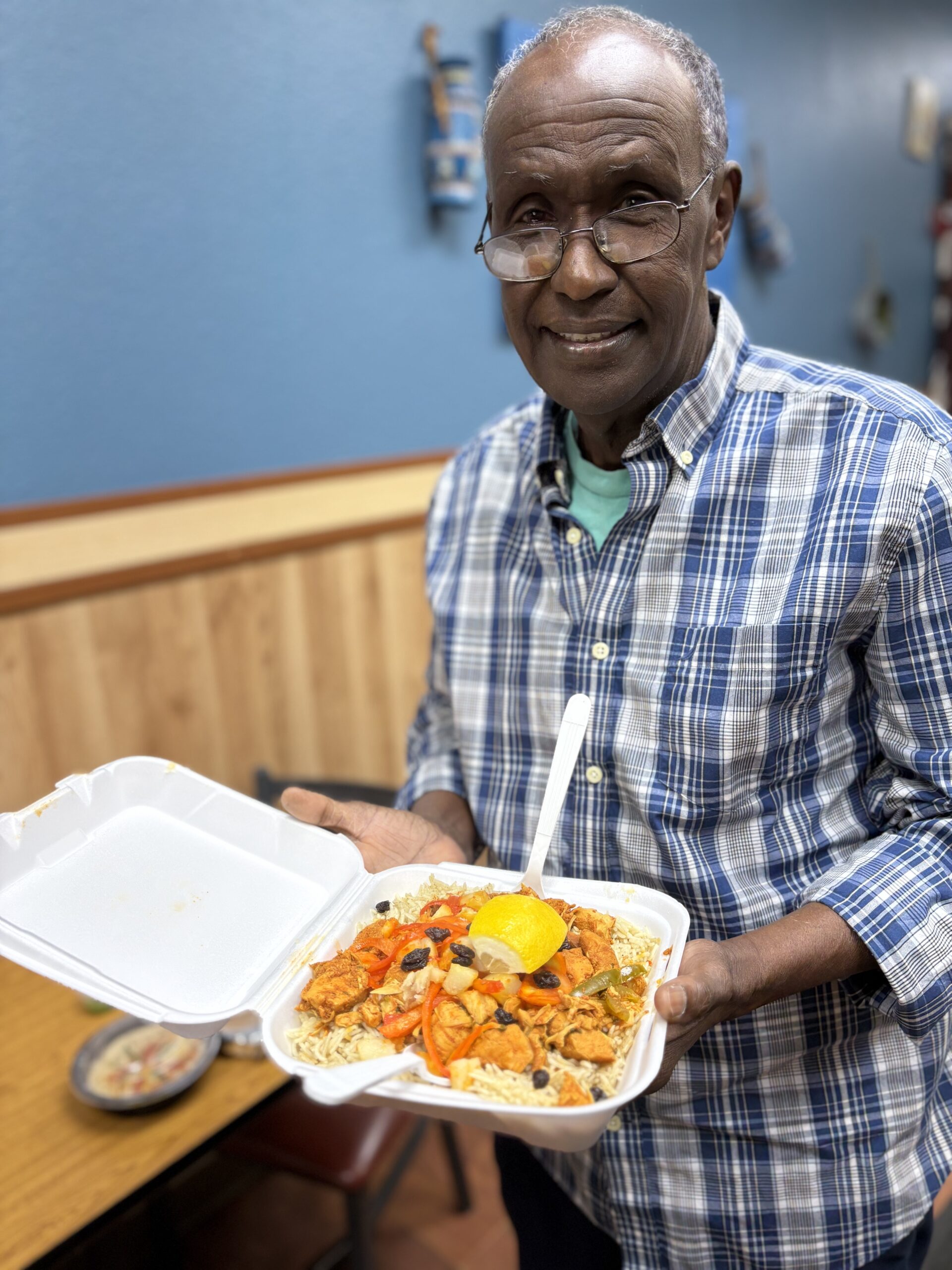 Abdirizak Aden holds an order of chicken suqaar, flavored with cumin, coriander, turmeric, paprika, potatoes and raisins on basmati rice.