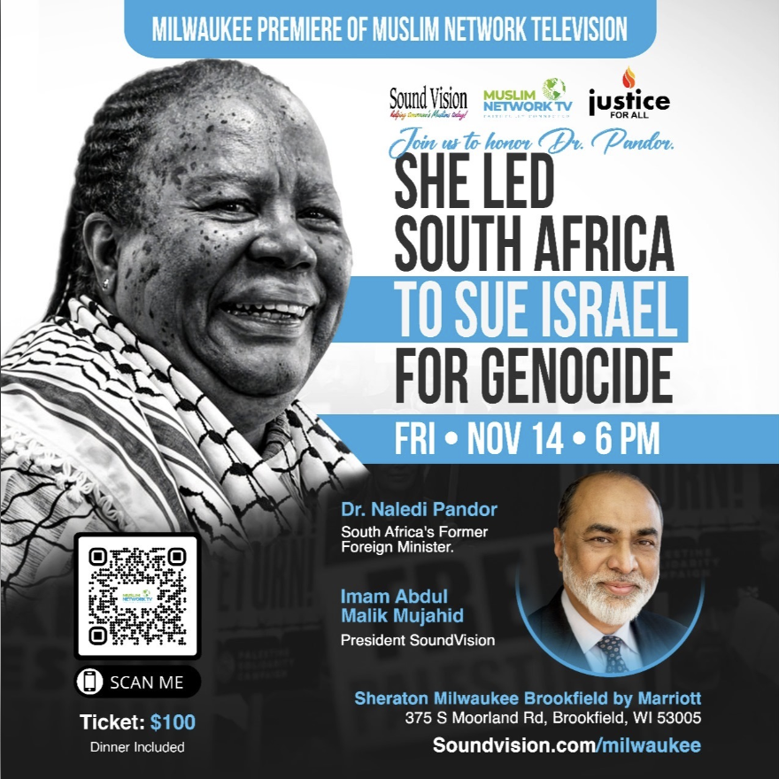 It is also an occasion to honor Dr. Pandor, who is traveling from Cape Town to support the rise of Muslim-led media in the United States, for her bold stand for justice—bringing Israel before the International Court of Justice for genocide in Gaza, said Sound Vision president and founder and Muslim Network Television CEO Imam Abdul Malik Mujahid in an interview with the Wisconsin Muslim Journal last week. (Dr. Mujahid was selected one of the 500 most influential Muslims in the world eight times.)