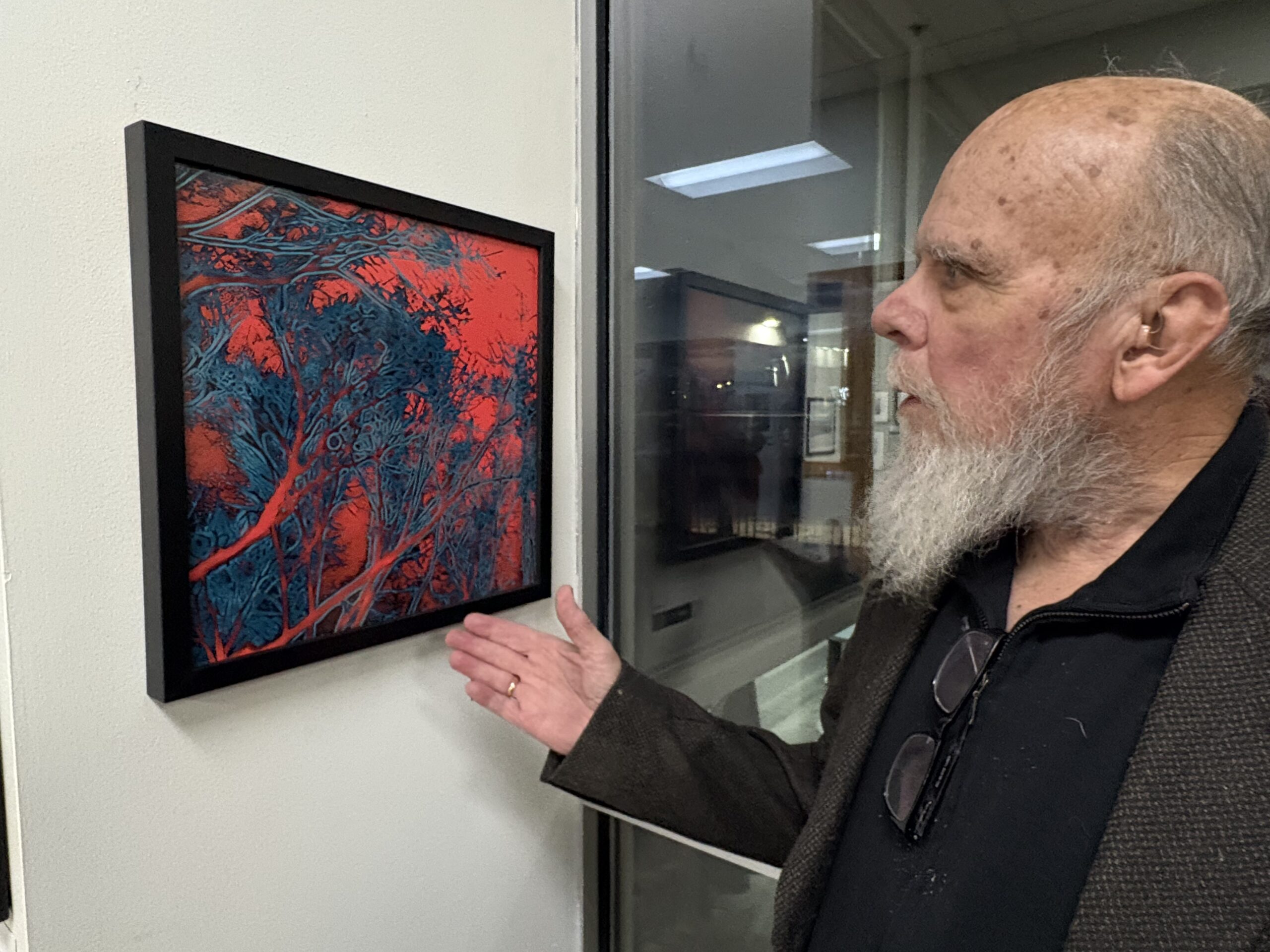 Alkhun’s intricately detailed paintings, inspired by the microscopic world of biology, have been exhibited regionally and nationally in juried and invitational exhibitions. Her work embraces a maximalist style, but each piece has a subject matter and a point she wants the viewer to discover. Each work of art also provides two perspectives depending on how close or far away viewers are from the work.