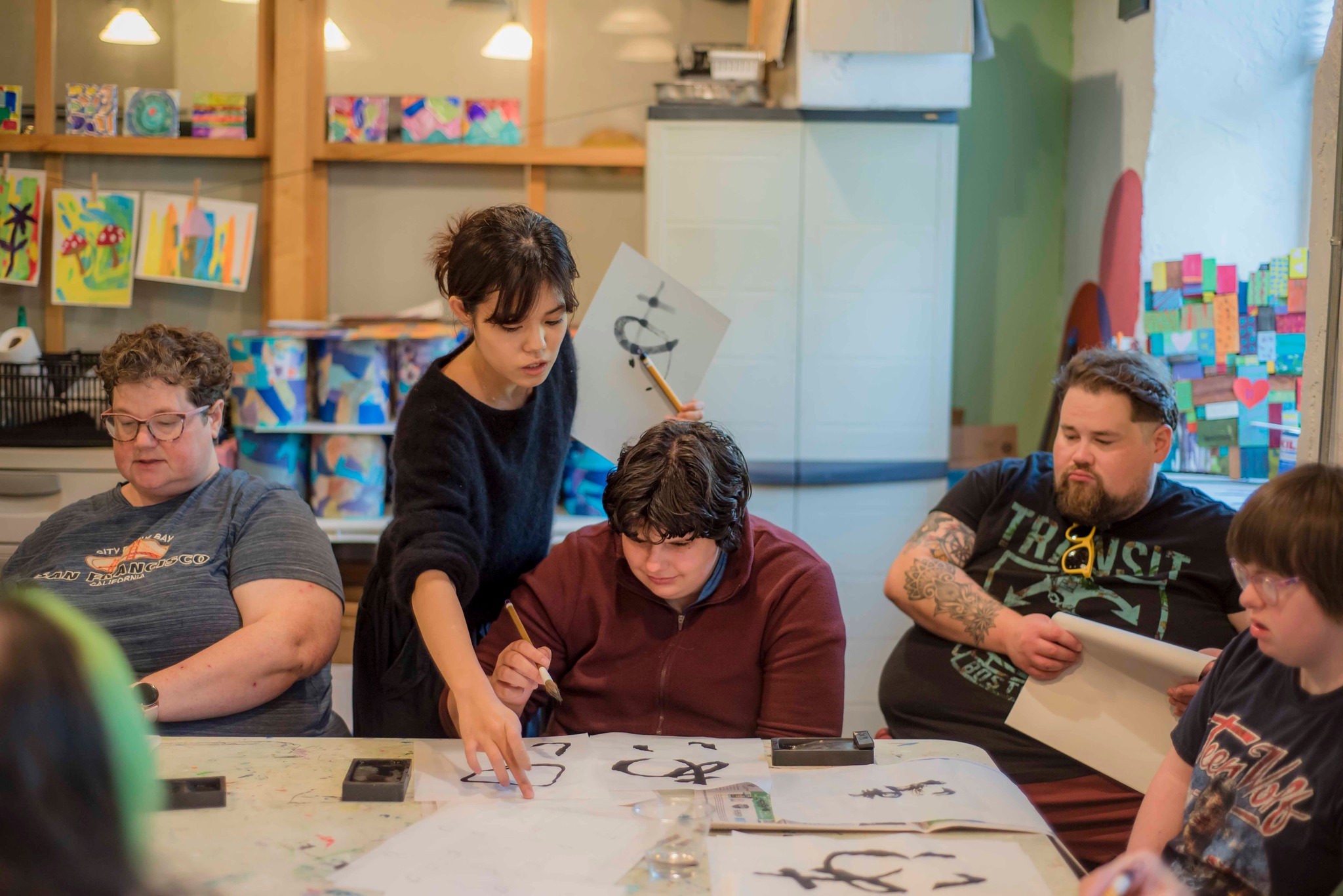 Iino facilitating a calligraphy workshop in Ozaukee with participants from Balance Inc..