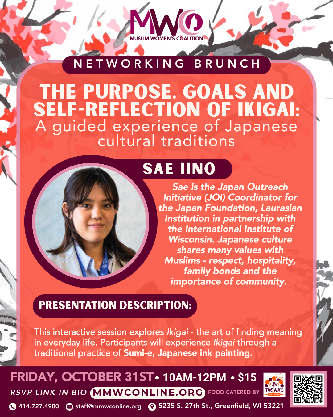 Muslim Women’s Coalition’s October Networking Brunch features Japan Outreach Initiative (JOI) Coordinator Sae Iino, of the International Institute of Wisconsin, who will lead participants in a guided experience of the Japanese tradition of sumi-e (black ink painting)