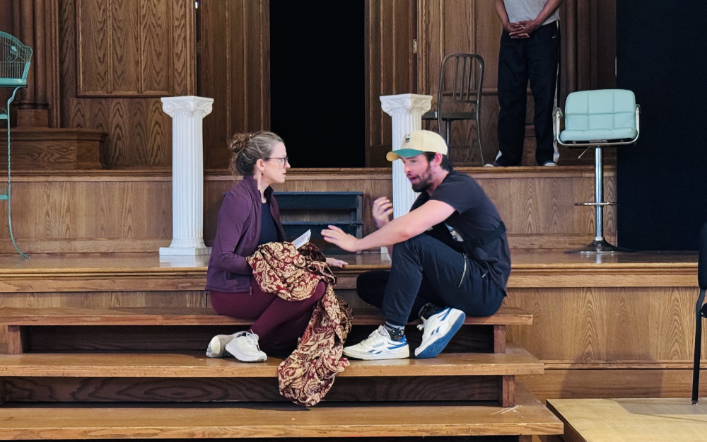 Maggie Marks (left) as Queen Atossa and Cole Castine (right) as Xerxes rehearse a scene.