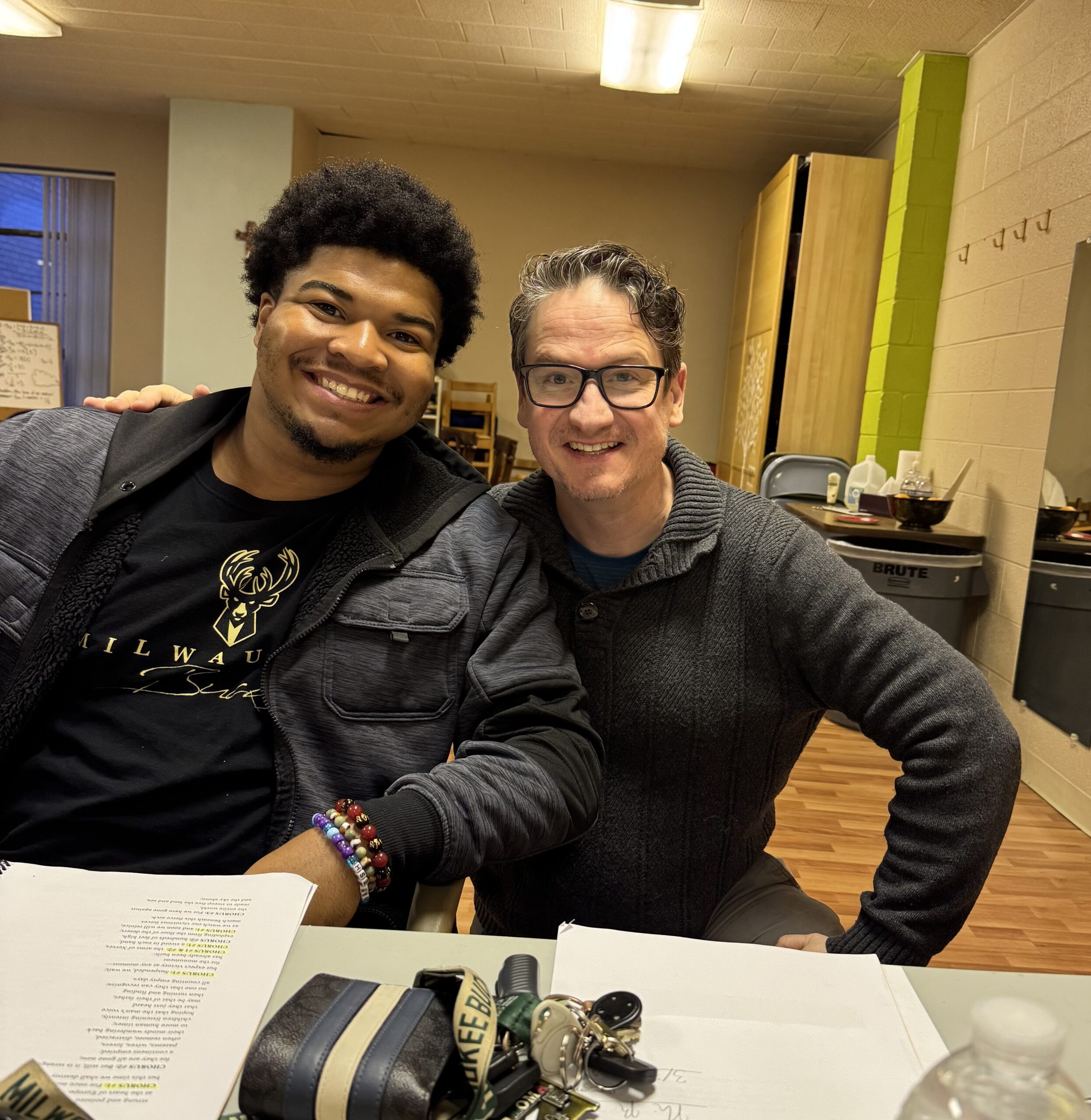 Nahjee Robinson (left), who plays the chorus leader in Wisconsin Classic Stage’s The Persians, and director Josh Pohja (right) pose for a photo during rehearsal.