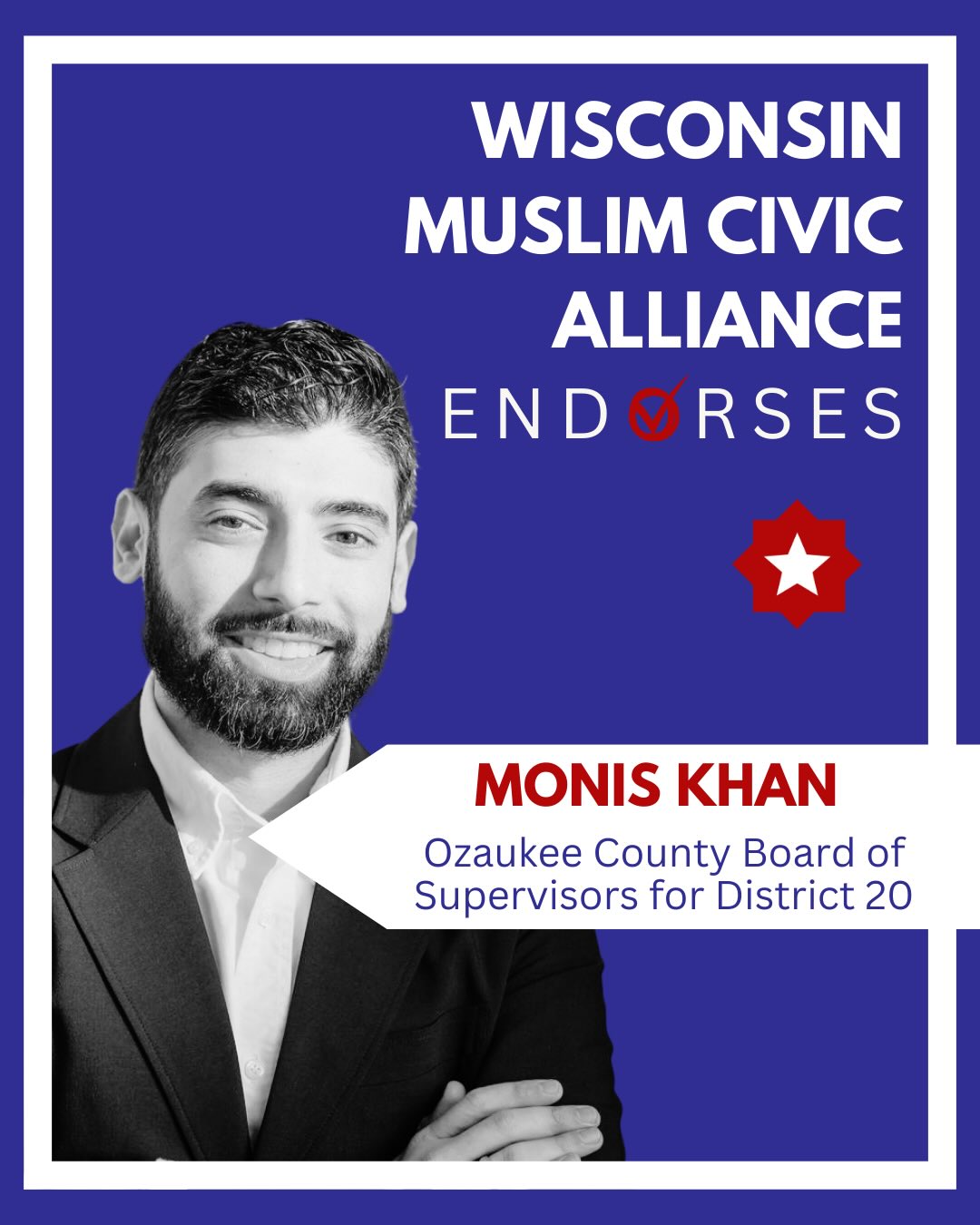 - Monis Khan, a founding board member of the Muslim Caucus of the Democratic Party of Wisconsin, is running unopposed for a seat on the Ozaukee County Board of Supervisors.